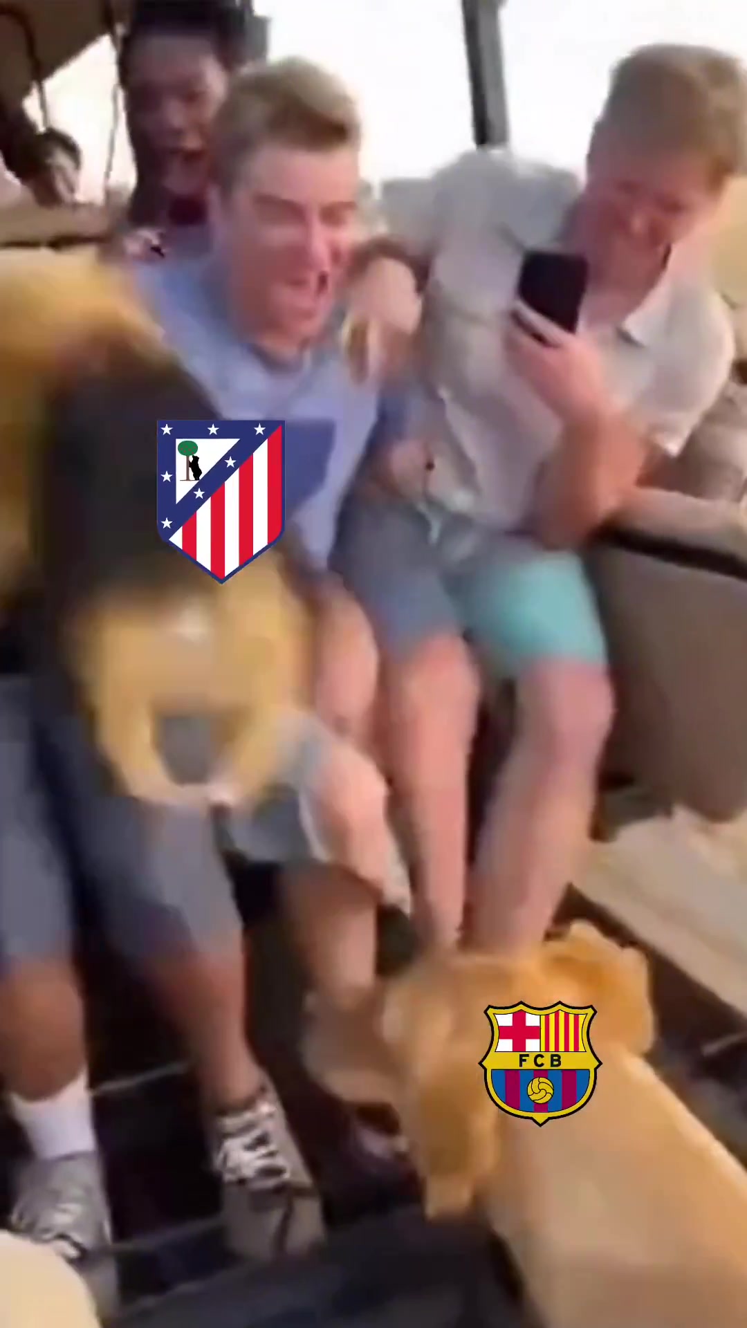 视频中,一只狮子被加上了巴萨队徽,跑到带着马竞队徽的人身前,被薅下头套,下面是条狗。